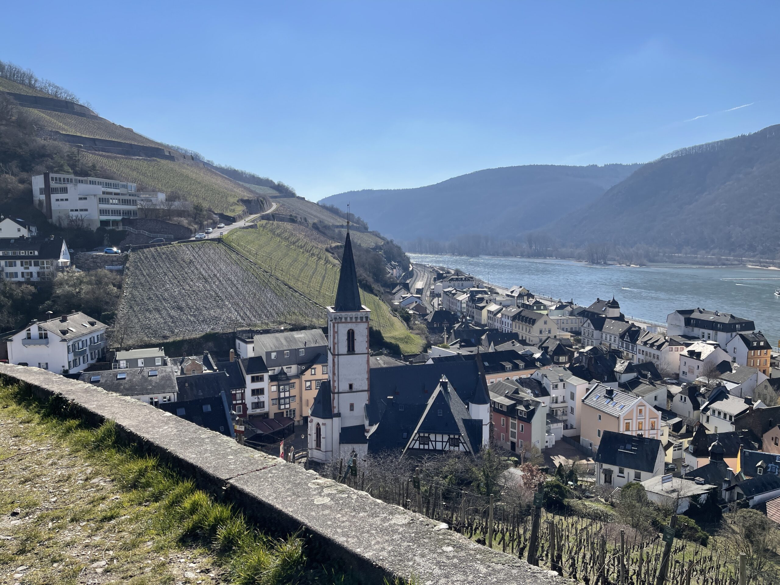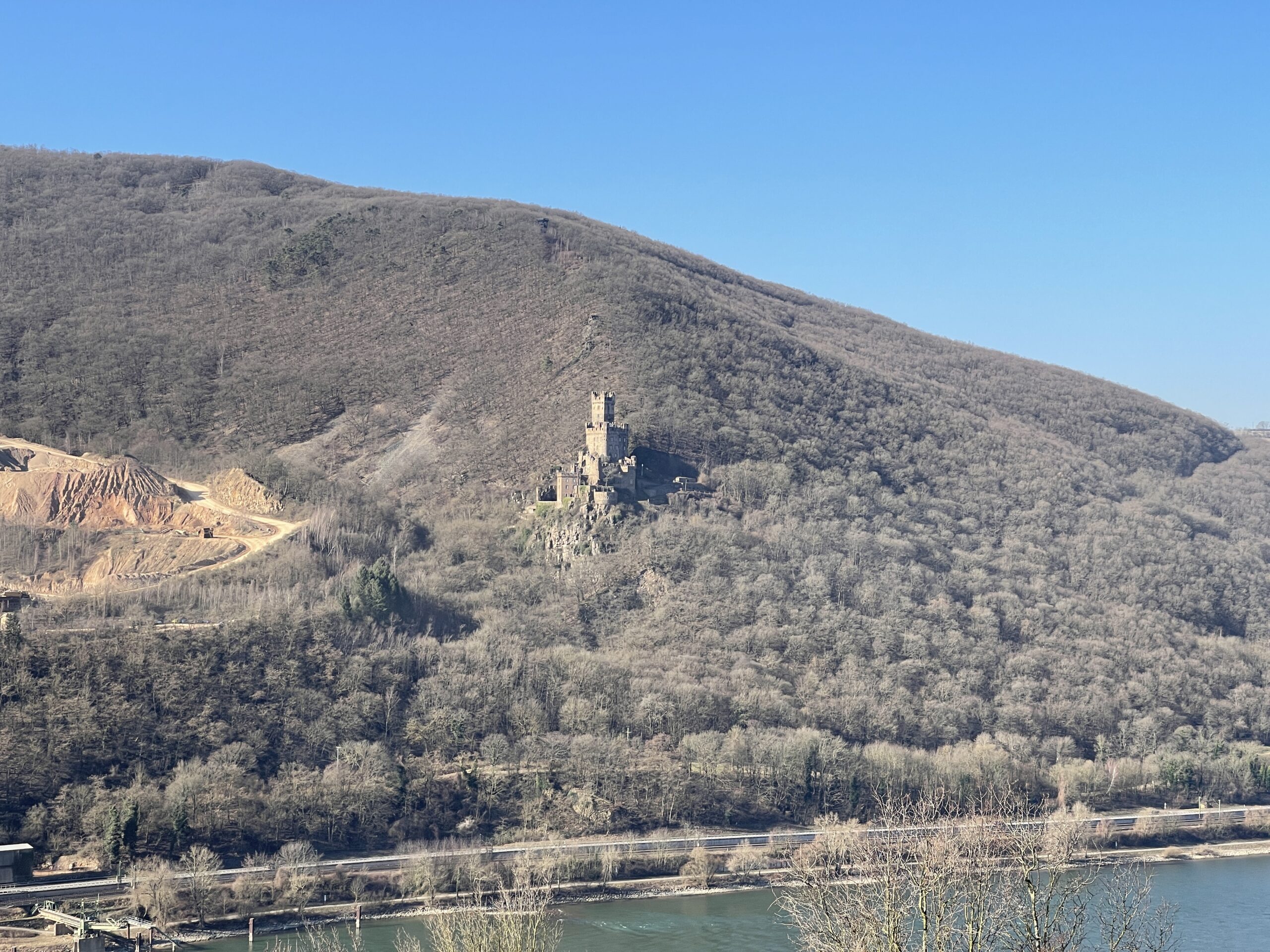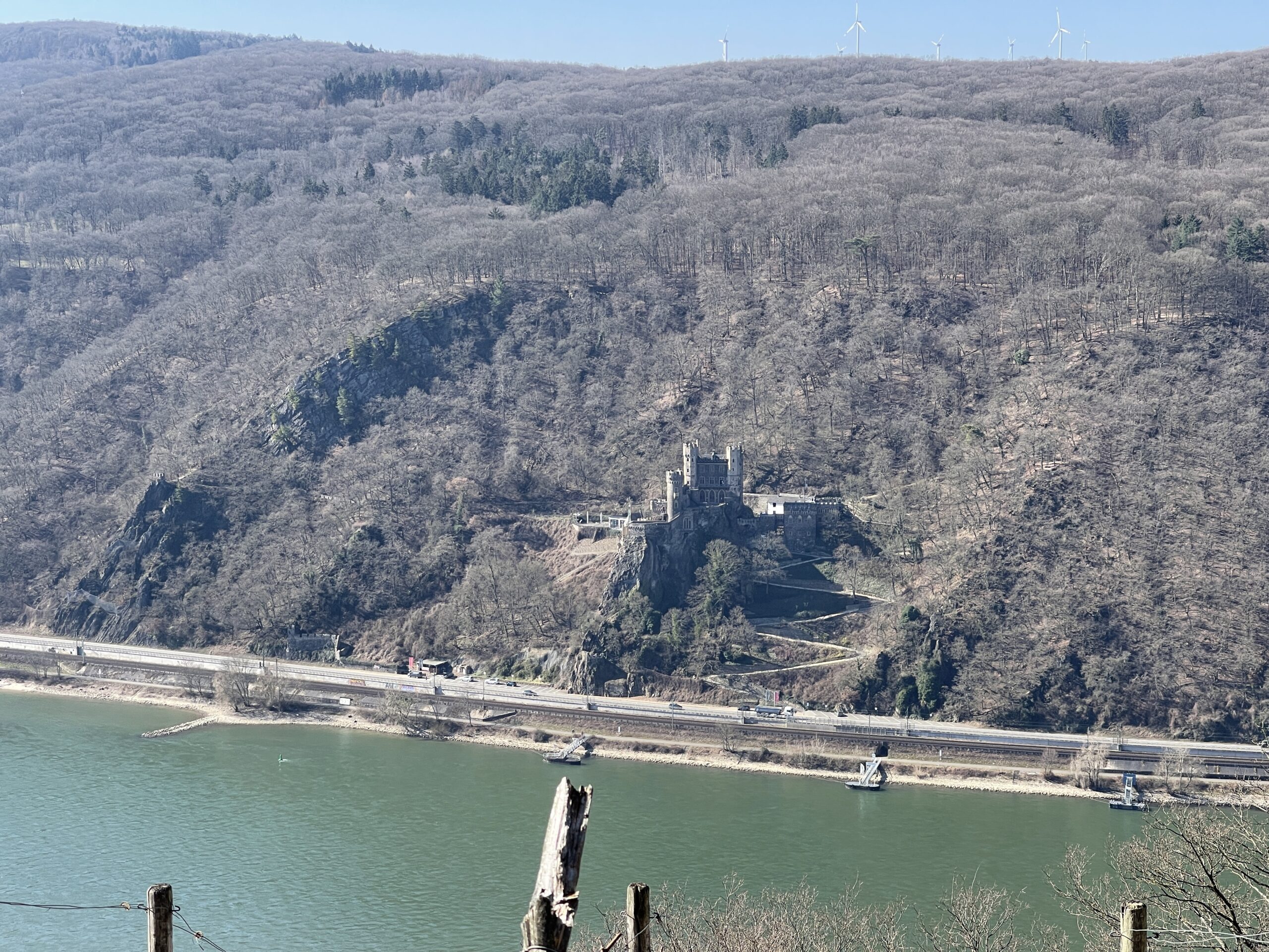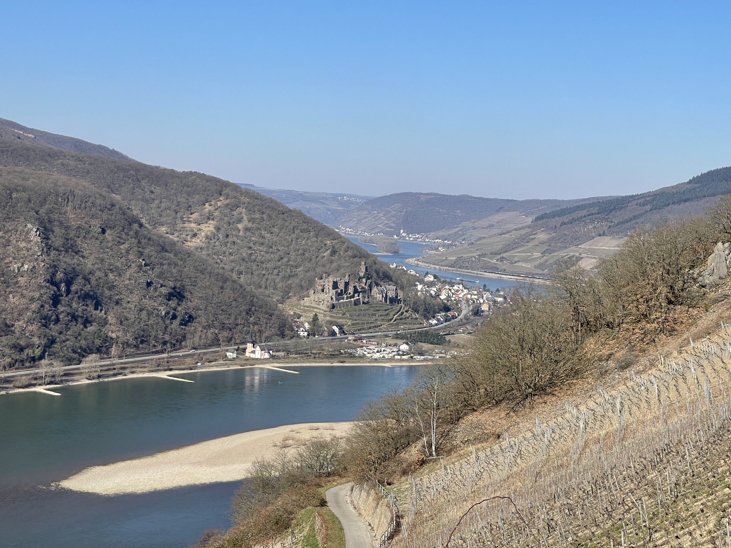 Aber der Weg ist auch sehr abwechslungsreich, viel durch die Weinberge, aber auch durch Naturwälder und zwischendurch immer wieder Aussicht – hier Burg Rheinstein