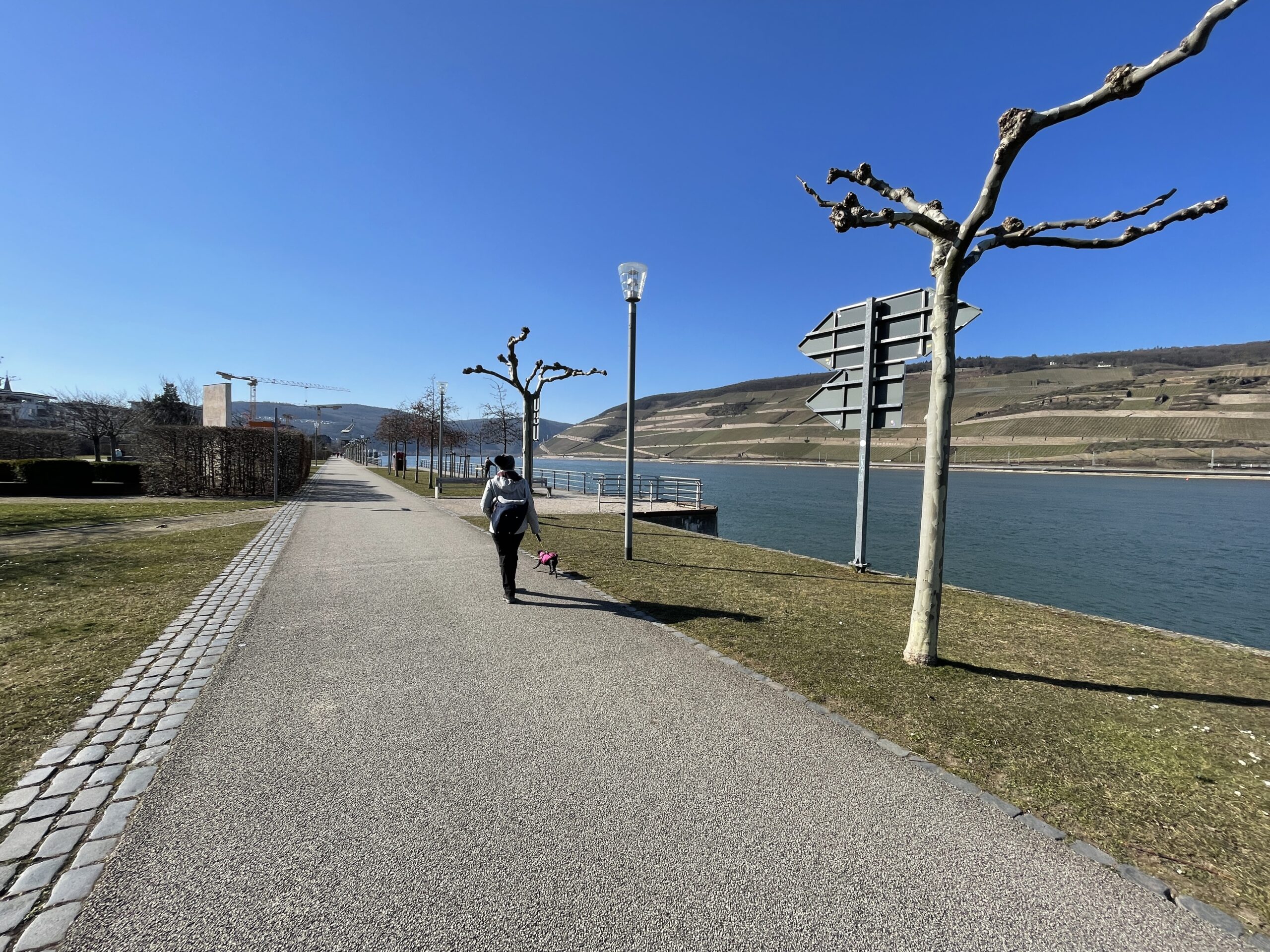 Jetzt sind wir wieder auf unserer linksrheinischen Seite in Bingen und laufen durch die Rheinanlagen. An der Bahnschranke mussten wir ca 10 min warten, das war aber nicht schlimm. Schließlich ist da eine Bank und es sind mittlerweile über 25km. Das merkt man.