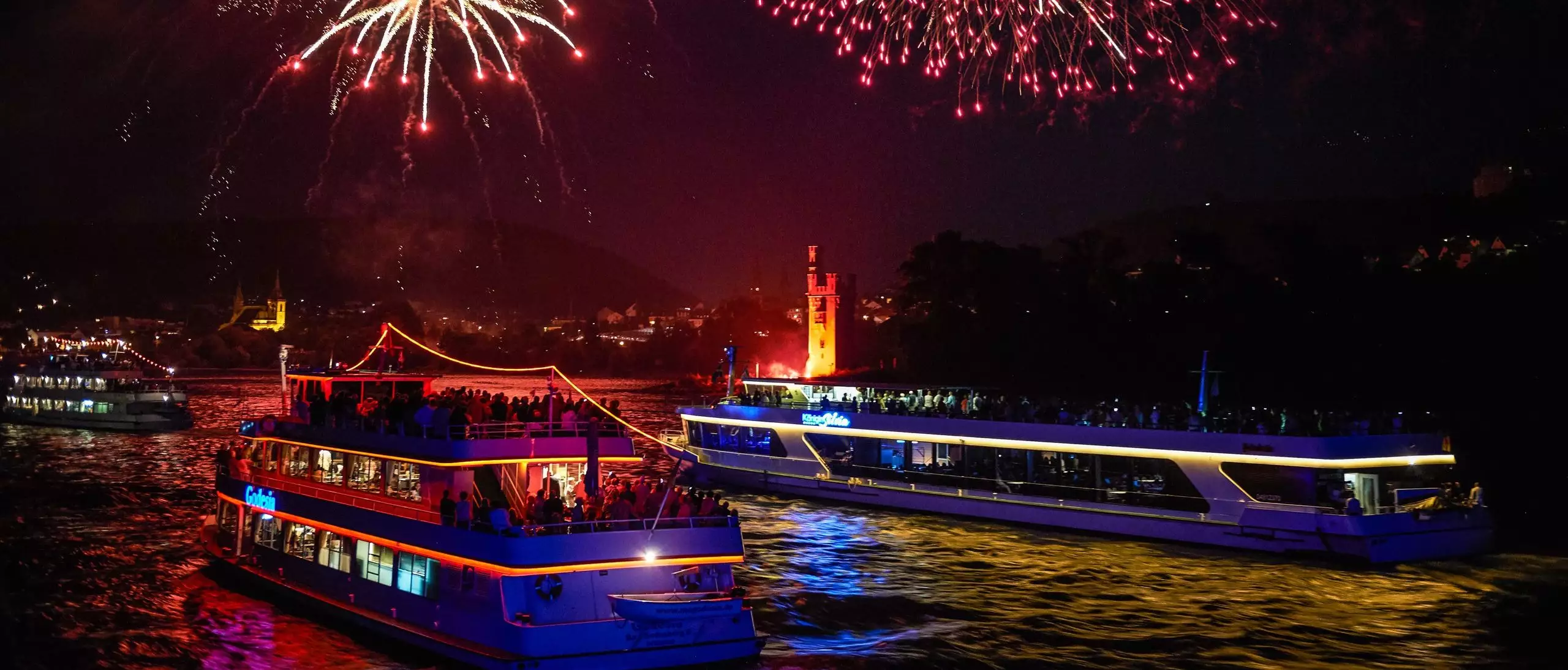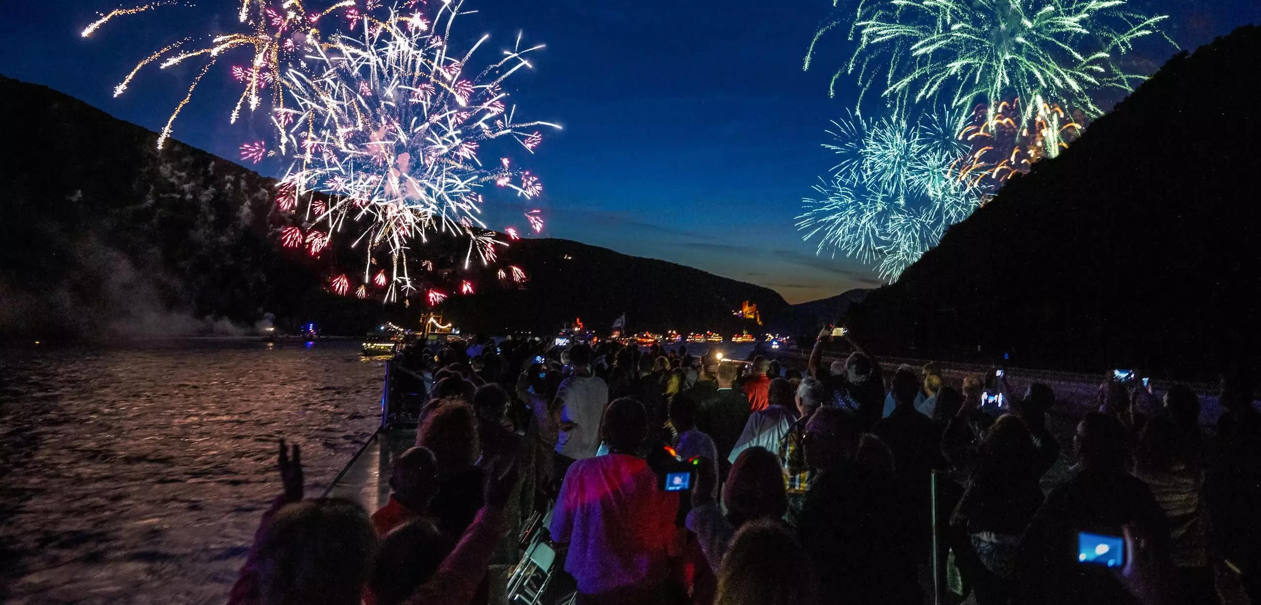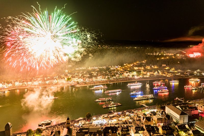 An vier Terminen zwischen Juli und September erstrahlen Orte und Kulturlandschaften, Burgen und Rheinanlagen und Höhenfeuerwerke begeistern die Zuschauer an Land wie auch auf den Schiffen. Begleitet werden die Schiffskonvois vom Donnergrollen der Prachtfeuerwerke, deren Echo sich in den Berghängen bricht und die das ganze Tal erzittern lassen.
